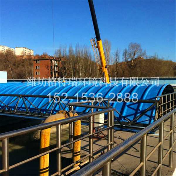 3、轻质高强、安装方便:玻璃钢集气罩比重仅为钢制品的1/3至1/4,固化程度高,载荷负重大,强度高,适用于大跨度池体,同时盖板可分为若干小块,便于运输、安装。